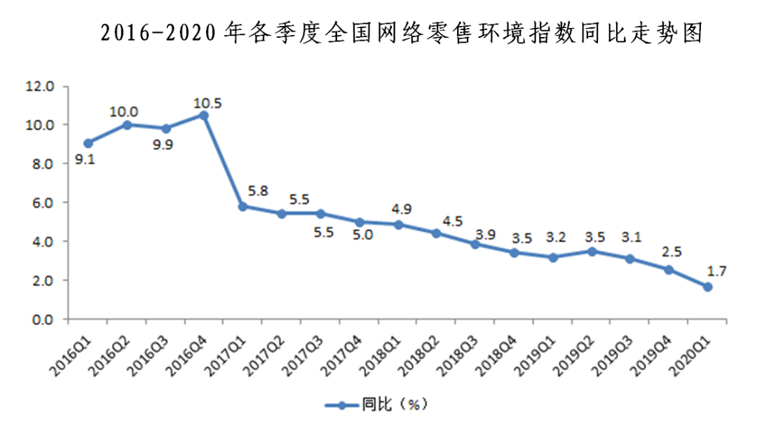 四、網(wǎng)絡(luò)零售環(huán)境指數(shù)同比增長(zhǎng)1.7%,環(huán)比下降0.5%。